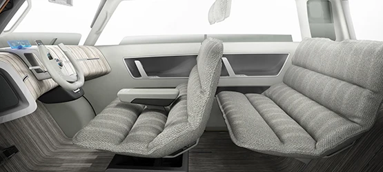 Enkelhed er den altdominerende oplevelse bag rattet af ME.WE. En skærm over rattet viser hastighed, batteriopladning samt rejse- og navigationsinfo sendt via smartphone. Du kan også indstille dit personlige førermiljø – lige fra kabinetemperatur til kommunikation, musik og apps – ved hjælp af din smartphone.