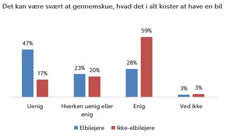 Desuden svarer hele 59 procent af ikke-elbilejerne, der er i markedet for en bil inden for de næste to år, at de er enige i, at det kan være svært at gennemskue, hvad det i alt koster at have en elbil. Blandt elbilejerne i undersøgelsen svarer 28 procent, at de er enige i det samme.