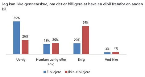 Således mener 51 procent - eller godt halvdelen - blandt de adspurgte ikke-elbilejere, at de er enige i, at de ikke kan gennemskue økonomien ved en elbil fremfor en anden bil. Blandt elbilejerne svarer 20 procent - eller hver femte - at de er enige i, at de ikke kan gennemskue, om det er billigere at have en elbil fremfor en anden bil.