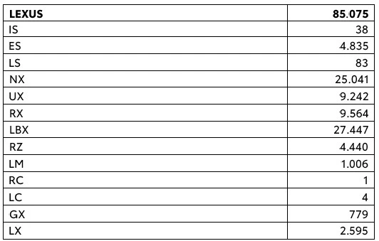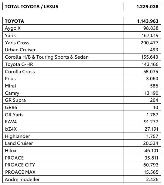 Ser man udelukkende på salget af Toyota-biler, blev der leveret 1,144 mio. fabriksnye biler i Europa i 2025 - en fremgang på 1 pct. - hvilket gør Toyota til det næstmest populære personbilmærke i Europa. Den mest populære Toyota-model er fortsat Yaris Cross, der produceres på Toyotas bilfabrik i Frankrig, med lidt over 200.000 solgte biler efterfulgt af Yaris, der produceres i både Frankrig og Tjekkiet, med 167.000 og Corolla med knap 156.000. Den mest populære Lexus-model i Europa i 2025 er den kompakte hybridbil, LBX, med over 27.000 solgte eksemplarer.